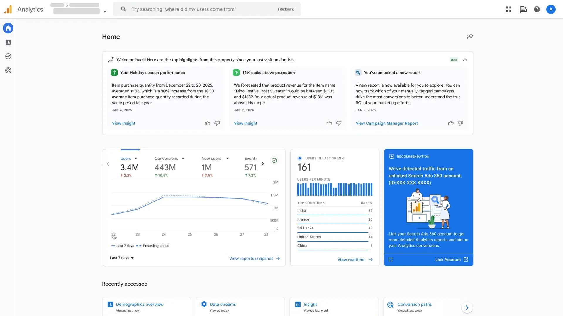 Google Analytics 4 bắt đầu từng bước triển khai Generated Insights trực tiếp trên trang chủ (Home page) của tài khoản. Thay vì phải tự mình mở từng báo cáo để kiểm tra hiệu suất, hệ thống sẽ tự động tóm tắt ba biến động dữ liệu quan trọng nhất khi bạn mở Google Analytics.